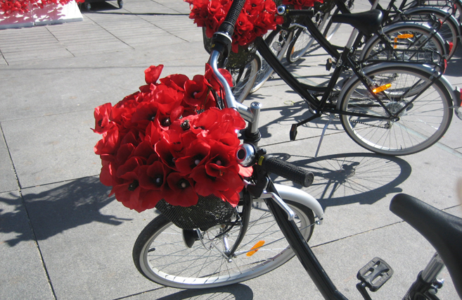 Acción: Dos plazas emblemáticas de Madrid se transforman por un día en una alfombra de amapolas. 100.000 amapolas llenan la ciudad.
