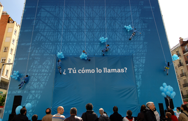 Acción: Pintar una lona de 100m2 en directo con acróbatas bailarines con ayuda del público. Vivir una experiencia 3d en la calle.